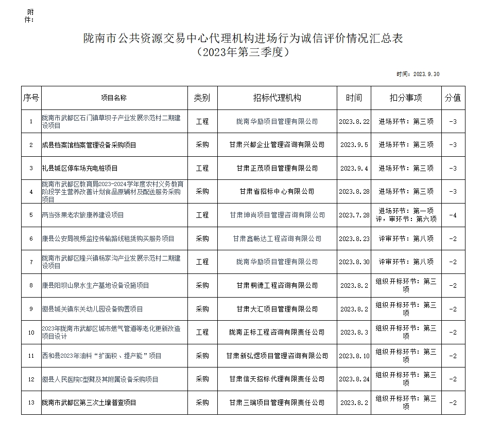 根據(jù)《甘肅省公共資源交易代理機(jī)構(gòu)管理辦法》(甘政辦發(fā)〔2019〕107號)和《隴南市公共資源交易中心代理機(jī)構(gòu)進(jìn)場行為誠信評價實施制度(試行)》規(guī)定,現(xiàn)對2023年第三季度,共 12 家代理機(jī)構(gòu) 13 條進(jìn)場行為誠信評價記錄予以通報(詳見附表)。請各代理機(jī)構(gòu)嚴(yán)格遵守各項規(guī)章制度、誠實守信,規(guī)范操作,為招標(biāo)人和采購人提供專業(yè)、高效、規(guī)范的招標(biāo)代理服務(wù)。