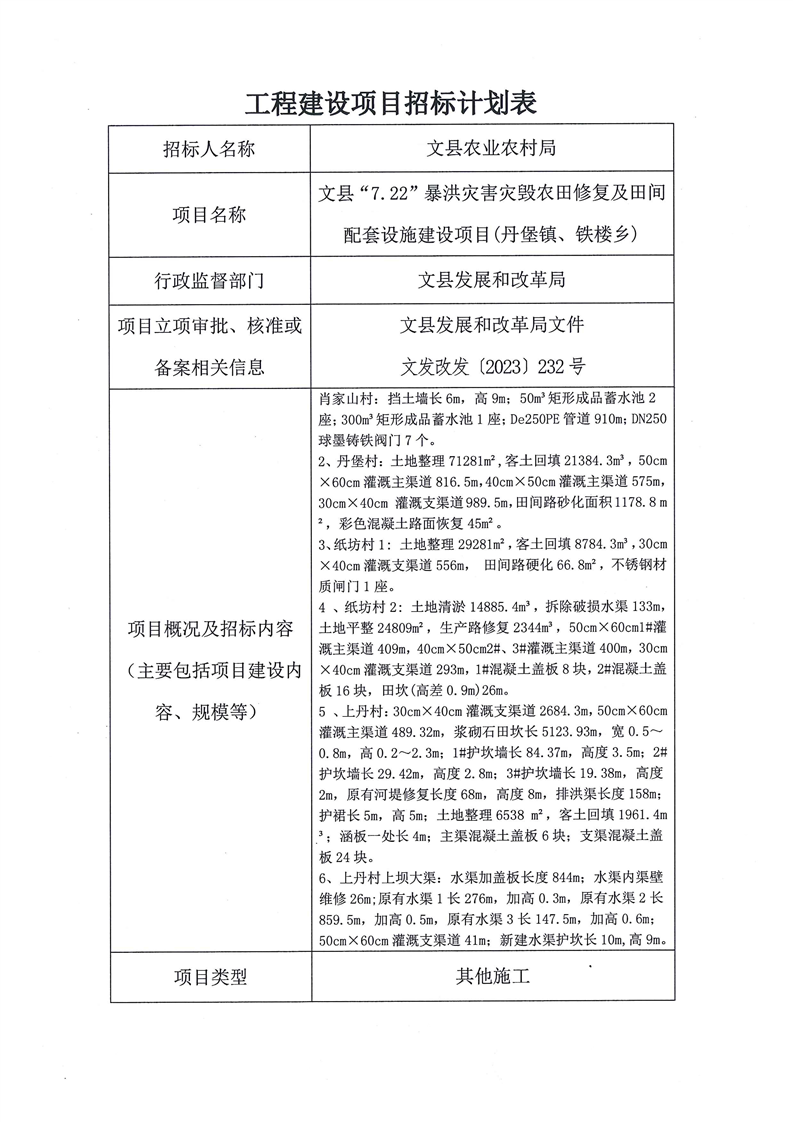 文縣“7.22”暴洪災害災毀農(nóng)田修復及田間配套設施建設項目(丹堡鎮(zhèn)、鐵樓鄉(xiāng))