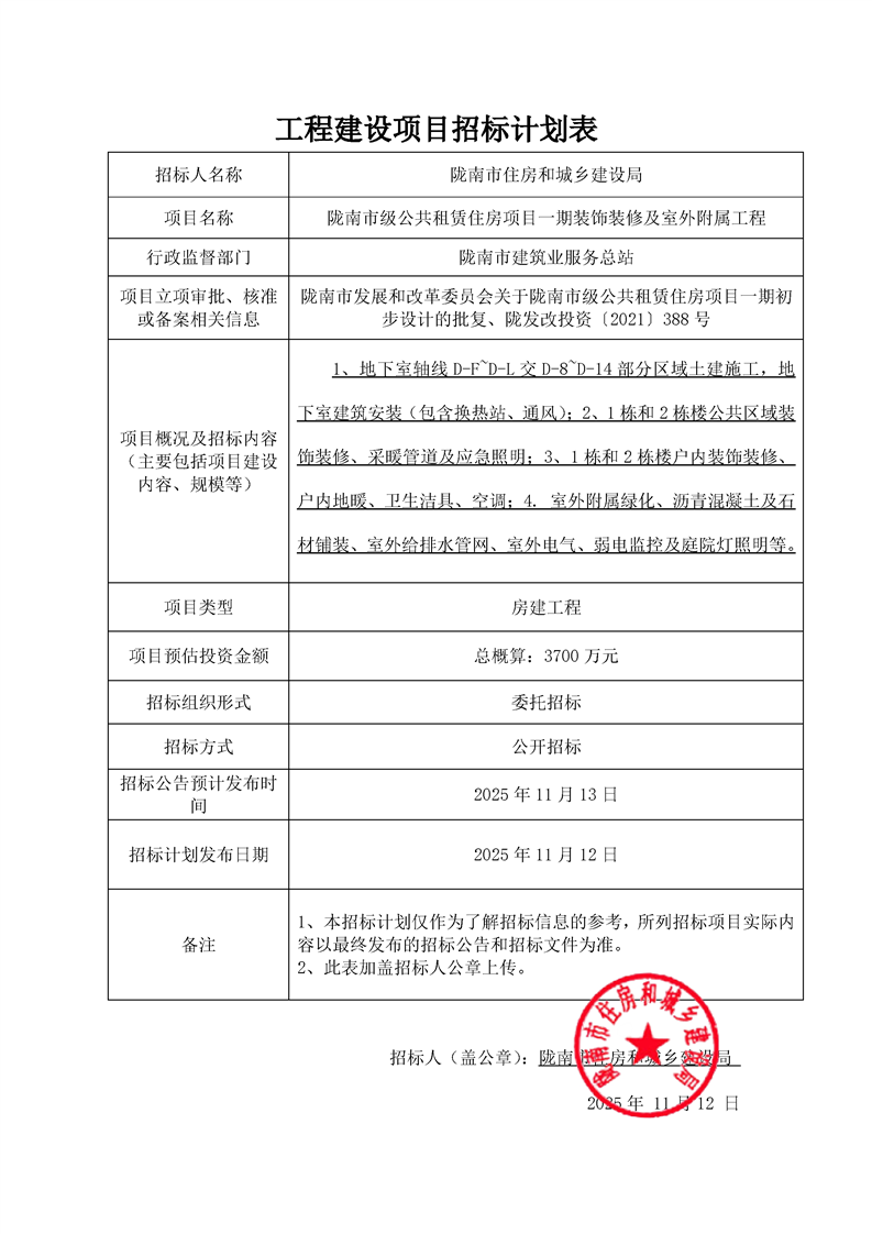 隴南市級(jí)公共租賃住房項(xiàng)目一期裝飾裝修及室外附屬工程