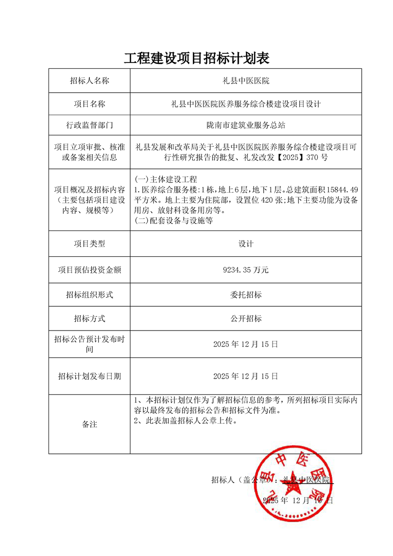 禮縣中醫(yī)醫(yī)院醫(yī)養(yǎng)服務綜合樓建設(shè)項目設(shè)計