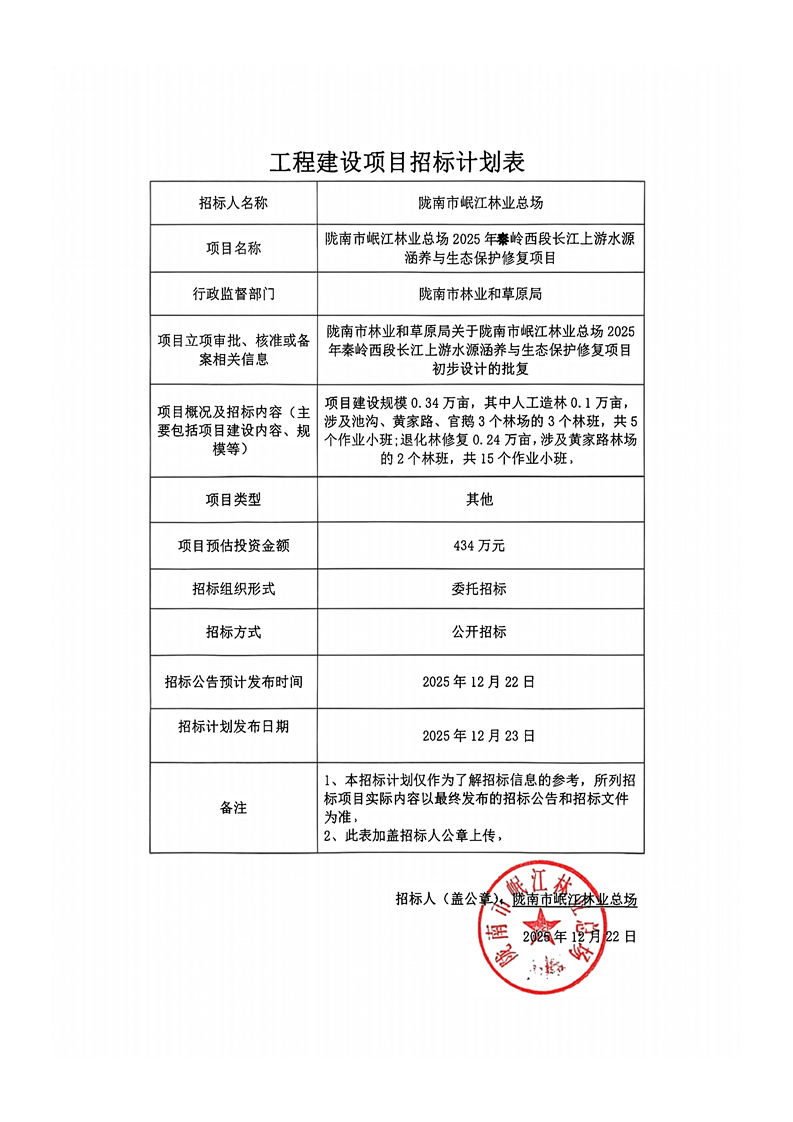 隴南市岷江林業(yè)總場2025年秦嶺西段長江上游水源涵養(yǎng)與生態(tài)保護(hù)修復(fù)項(xiàng)目