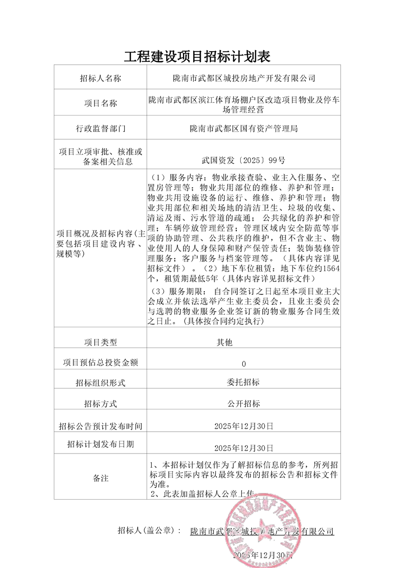 隴南市武都區(qū)濱江體育場(chǎng)棚戶區(qū)改造項(xiàng)目物業(yè)及停車場(chǎng)管理經(jīng)營(yíng)