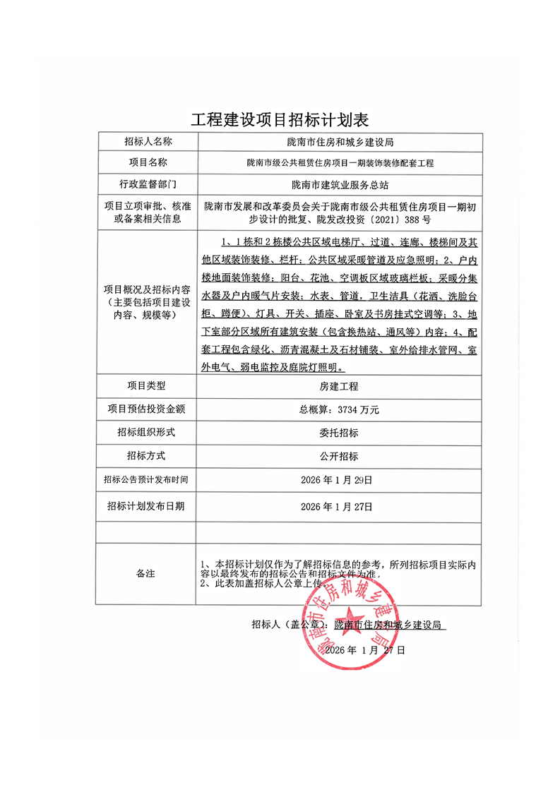 隴南市級公共租賃住房項目一期裝飾裝修配套工程