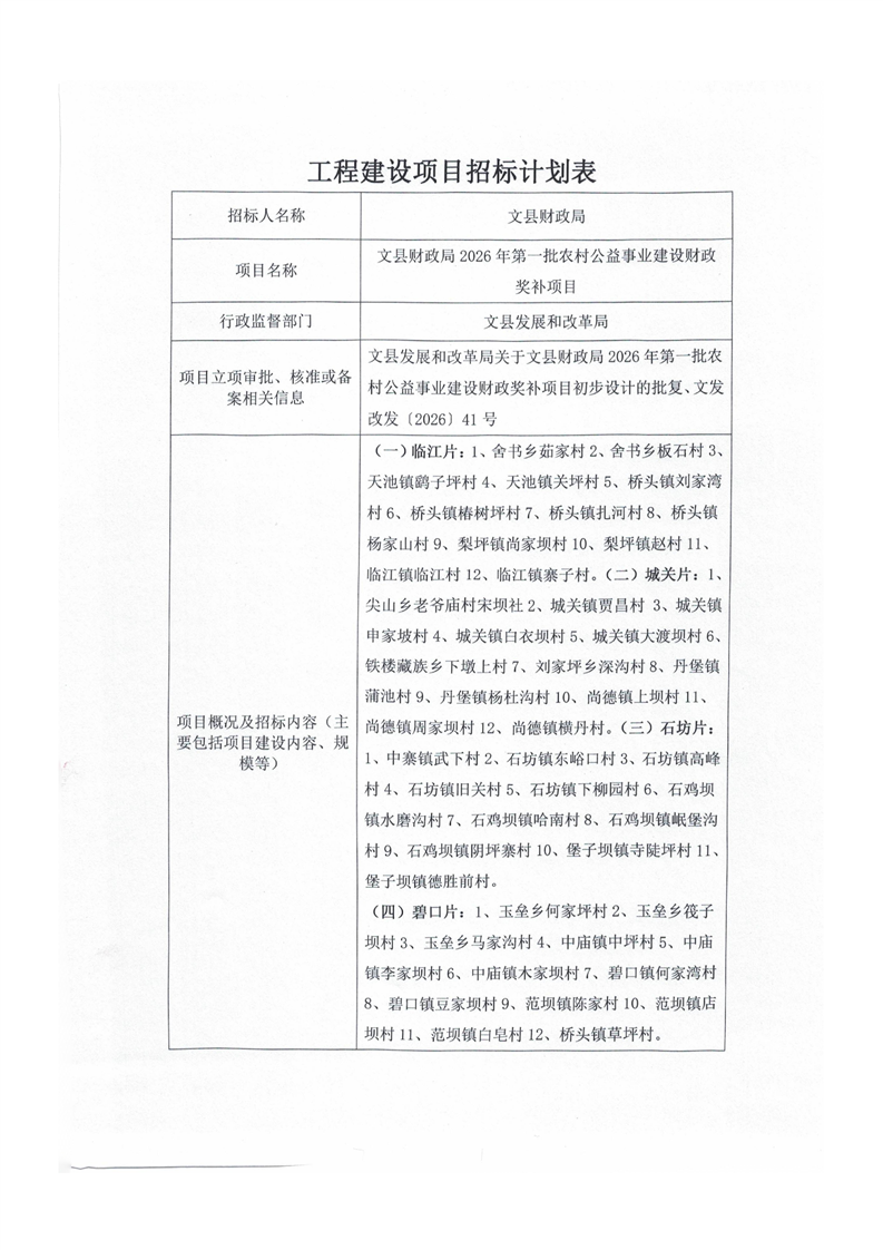 文縣財政局2026年第一批農(nóng)村公益事業(yè)建設財政獎補項目
