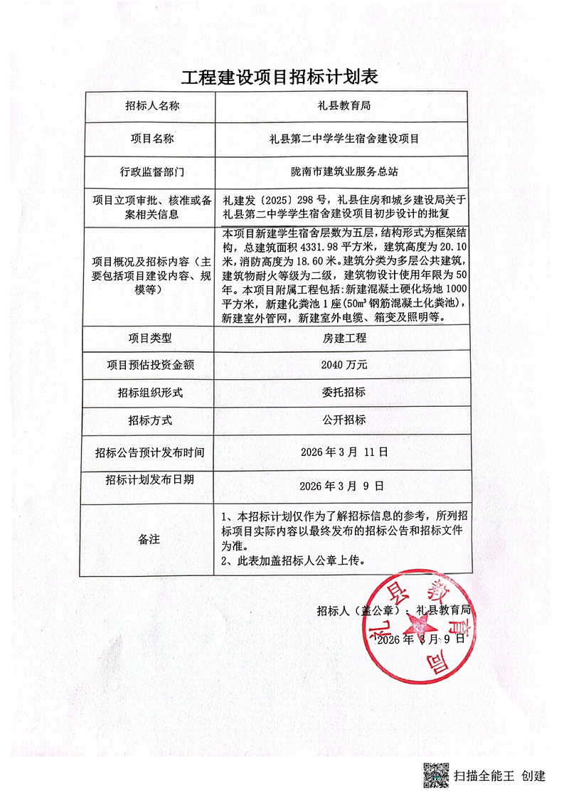 禮縣第二中學(xué)學(xué)生宿舍建設(shè)項目