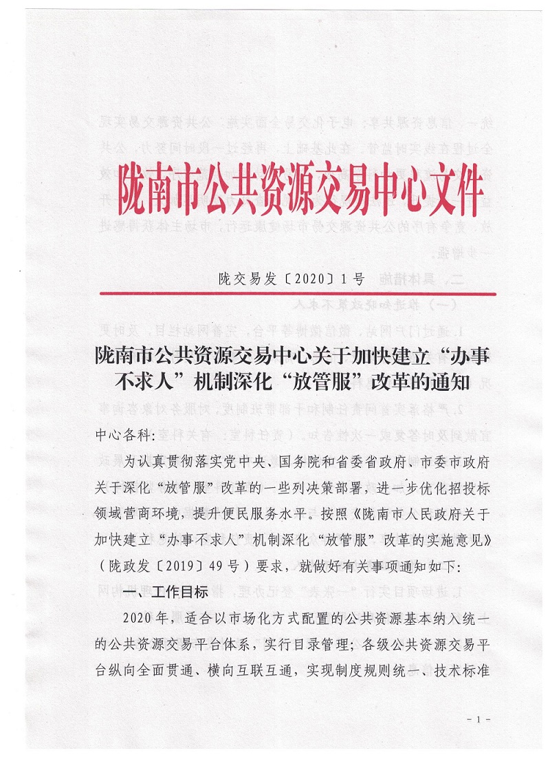 隴南市公共資源交易中心關(guān)于加快建立“辦事不求人”機制深化“放管服”改革的通知